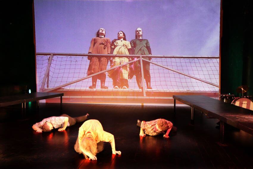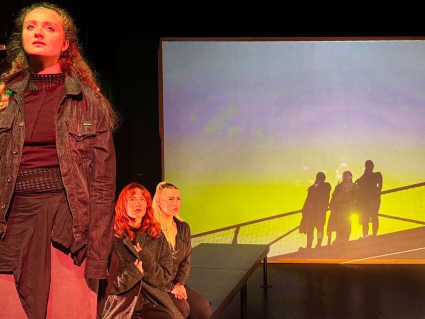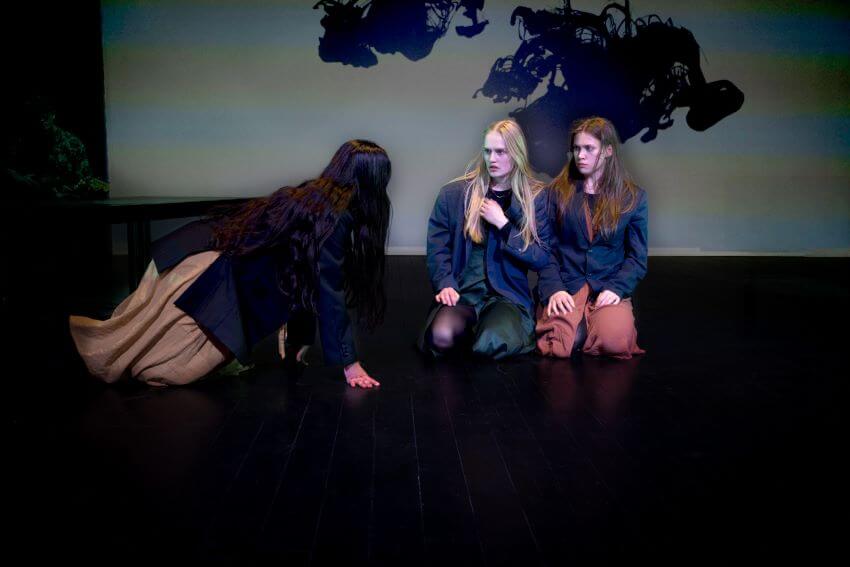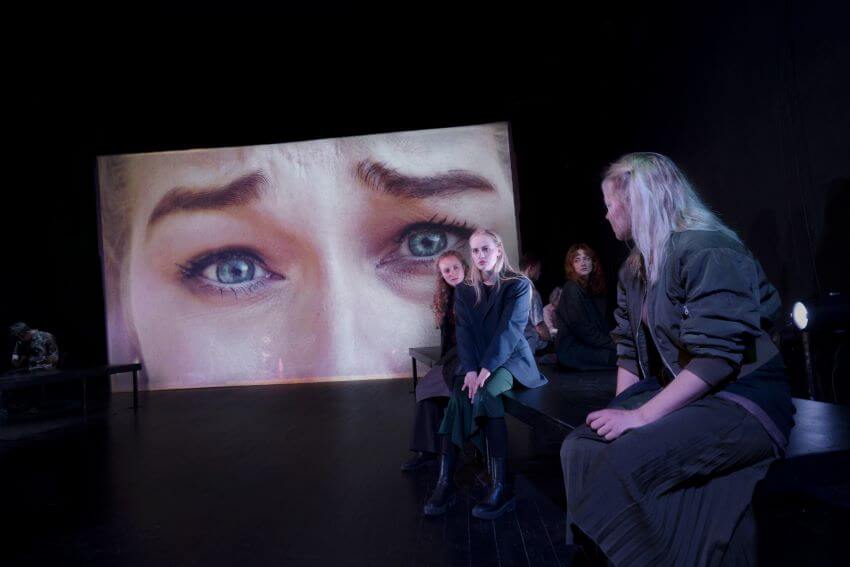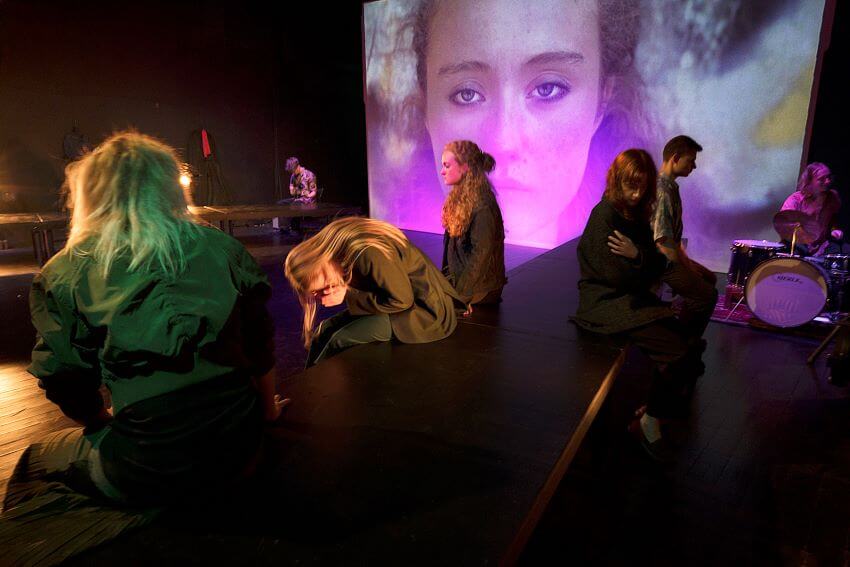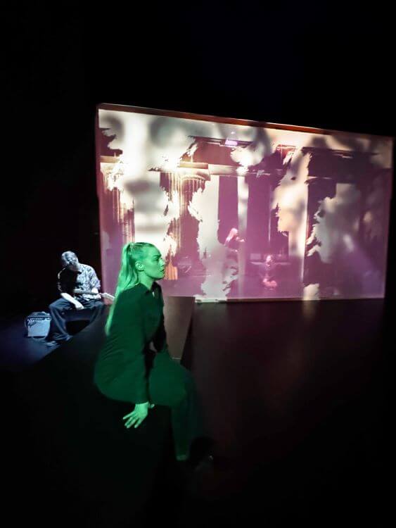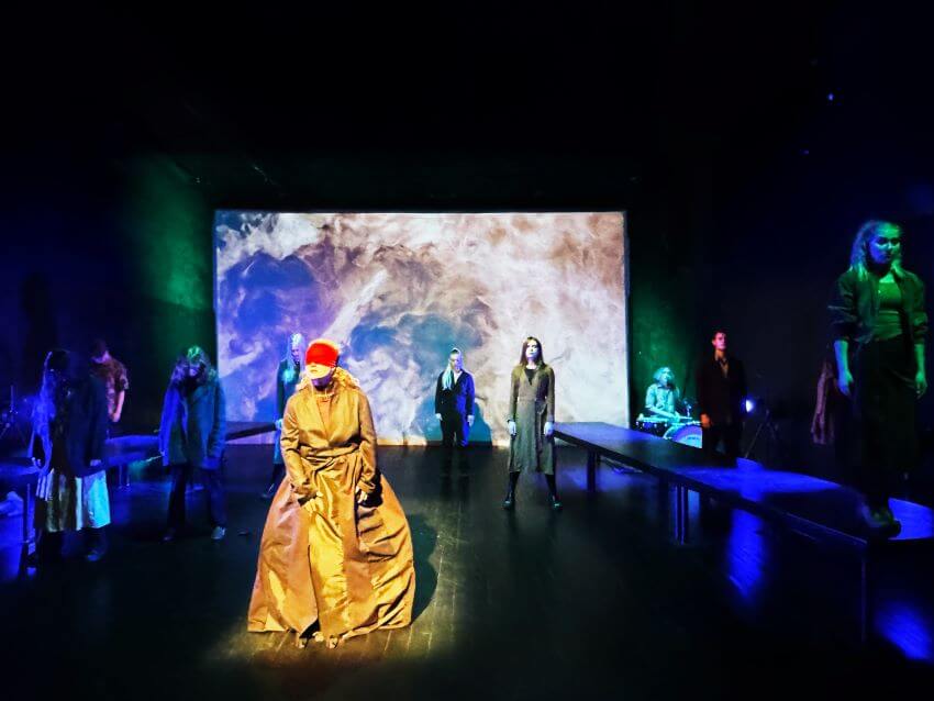 The production examined the play from the perspective of social injustice, gendered and racialized marginalisation, and (violent) resistance in a cynical world, reflecting on perspectives which still resonate today. The transcultural stance, with acting students from different parts of the world, re-situated Medea’s tale of abandonment and revenge within an ecumenical framework of shared grief and historical wound. The hybrid chorus—partially live, partially projected in film— built a multi-lingual sonic tapestry through which pain, exile, and survival were collectively processed. The performance was enhanced by a transdisciplinary form and aesthetic, mixing physical theater with an original music score performed live, as well as with film and video projections, sculpting a postdramatic landscape where the ancient text was revisited with irony as a form of communal, post-tragic lament.